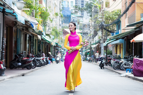 Chào đón Tết nguyên đán Giáp Ngọ 2014 sắp đến, á khôi Trịnh Thu Thảo cùng êkip ghi lại những hình ảnh dịu dàng, e ấp trong tà áo dài truyền thống tại một khu phố cổ ở Sài Gòn.
